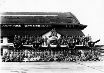 Howard Field, Panama, 91st Photo Recon Squadron Standing on Ramp, L to R: 1st Lt. Harris, 1st Lt. Homan, 2nd Lt. Menual, 2nd Lt. Dempsy, 1st Lt. Roberts, 2nd Lt. Mays, 2nd Lt. Thielen, 1st Lt. Newell, Maj. Finan (Sqdn. Cmdr.), Capt. Drinkwine, 2nd Lt. Klingler, 2nd Lt. Davenport, 1st Lt. Jacobson, 2nd Lt. McCamic, 2nd Lt. Winnett, 1st Lt. Harrington, 2nd Lt. Jordan, Capt. Jacobson, 2nd Lt. Seymour, 1st Lt. Boorman, Capt. ????ld. |