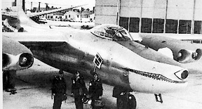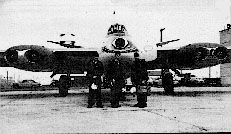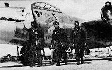 The 91st SRW was one of the first units to use aerial refueling aircraft in combat. On 29 July 1952, Major Louis Carrington flew a 91st SRW (Strategic Reconnaissance Wing) RB-45C on the first non-stop, transpacific flight and won the third Mackay Trophy ever presented. (6) Above, the “bloodshot” eye of RB-45C “No Sweat” seems to glare down on the crew that flew this award-winning flight. Major Carrington is shown on the right hand side of both photographs immediately after the 4,000 mile flight. (7) |