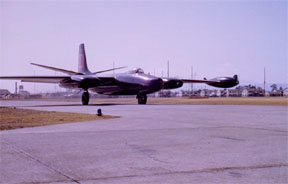of the 91st Strategic Reconnaissance Squadron at Johnson AFB, Japan. (10) Below: RB-45C, painted black to help avoid being detected by the North Korean searchlights, taxies out for takeoff at Yokota Air Base, Japan. (11) |