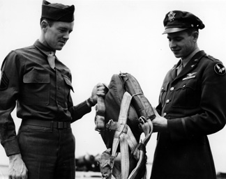 Above: Maj. Pat McCarthy, who had just taken over as Squadron CO, and Captain Becker. This photo was taken just a few days before Capt. Becker had to bail out of the Queen with his full crew of 7 while on a test flight after having the five man rafts replaced by seven man rafts by the subdepot at MacDill. - November 1943.