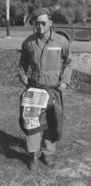 Capt. Becker’s photographer, displays the back of a flight jacket typical of the one worn by all crewmembers flying the Hump in the event they went down in China or Burma. |