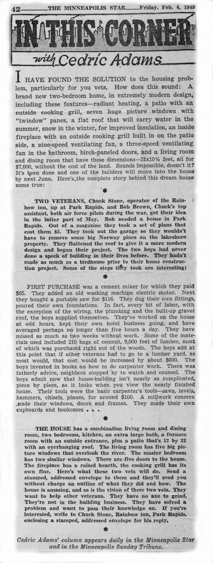 Here is the story that Cedric Adams published in The Minneapolis Star for Friday, February 4, 1949