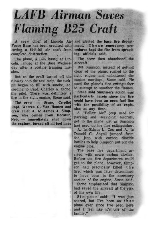 Our Wing Commaunder, Colonel Coleman, called me in and said he had an important job for me. Recently one of our B-47s had come spinning down out of the clouds because the A/C had become hypoxic (lack of oxygen). The airplane landed safely, streaming fuel out of its over stressed structure. The airplane was determined to be Class 26 (junk). Our Wing had been having some other problems with survival equipment. Colonel Coleman told me it would be my task to look into every possible element of our survival equipment supply, management and application structure and fix whatever I found wrong. I was reassigned to the Wing Headquarters Squadron as part of this change. I arranged to go to Scott AFB, IL, and take in a survival equipment training course. Returning to Lincoln, I began digging into supply bins, talking to people, developed a periodic newsletter on the subject and gave lectures at gatherings of interested troops. Colonel Coleman seemed pleased with the results and I soon found myself installed at the Wing Ground Training Officer. In all truth, this was a job that most flying officers looked down upon with disdain. Unfortunately, I had this personality defect that if thrown into a pile of horse manure, I immediately started looking for a pony. This harks back to the pledge I made to myself when recalled, remembering the fiasco of my day of graduation as a rated pilot. When I was sworn in at recall, I pledged to myself that if I were asked to sweep the hangar with a push broom, I was going to have the cleanest hangar on the base. I intended to enjoy being the new Wing Ground Training Officer, despite the general attitude that air crews were just too busy with air issues and there was no time left to deal with ground training requirements. My challenge was to find ways to make these neglected, but required and important, training programs fit into their tight schedules. As I got my feet on the ground, I realized that one of the main reasons for non- compliance was the lack of standardized reference resources for Squadron Operations Officers and Air Crew Members to know where and when training options were available. Schedules changed quickly for an individual crew due to weather, maintenance, illness, etc. I soon had designed a workbook that contained all of the elements of our ground training requirements with training slots (entry blanks) for each workday of the coming week. I had key flying squadron members appointed to meet with me weekly to fill in the blanks, based upon known flying schedules, etc. We would have this meeting about Thursday and using the new copy machine, now available on the base, I would run off copies of the filled-out document for distribution to each Operations Officer and each crew in each squadron, by late Friday. As the scheduled week began to unfold, everyone involved had a document in hand where they could put and take people in the schedule to deal with day to day changes. This took lots of work hours on what might have been off duty time, but I was determined to make it work. In the meantime, my pilot rating was not gathering dust. The base had two B-25s for administrative use, based out of Base Operations. My near 1,000 hours in this aircraft came in handy and I was soon giving flight checks to many rated people that did not have access to B-47s or KC-97s. There was many a day when I worked a full schedule in the office and gave flight checks in the evening and after dark. A visiting safety inspector was critical of the quality of the B-25 check lists and I volunteered to write a new one from scratch. The resulting check list ended up being used at other SAC bases with B-25s assigned and it caused 8th AF Headquarters to try and get me transferred to their Headquarters. My supervisors managed to dodge that bullet and I remained with the 98th. You may be sure that I was just glad to hang on to my flying status. When my back was bent out of shape, I could skip a few days and just do my ground job. There was a time while test hopping one of the B-25s, the aircraft’s right engine burst into gas-fueled flames just after touch down. The copilot, engineer and I got the heck out as soon as we could stop the airplane. While the copilot and I were trying to clear out of the immediate area, we noticed the engineer had a hand fire extinguisher and was trying to get foam up into the engine nacelle. The raging fire was diminishing so we both went back to give him a hand. The base fire trucks were just arriving and we kept passing him fresh foam bottles until he had the fire killed. Inspections determined they had failed to reconnect a gas line during their maintenance process. Fresh fuel had accumulated in the nacelle, in flight, and had caught fire at touchdown with the change of airflow over the exhaust stacks. I was able to get a Commendation Medal for the gutsy and faithful engineer and he certainly deserved the recognition. |