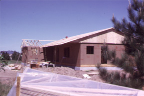 To get by, we purchased some old store display cabinets at an auction, set them up in the family room and used them to store nonperishable materials. As soon as we had a feel of our house layout, we began drawing up the kitchen cabinet arrangements, ordered the materials and began their construction. When they were installed in place, we found them to serve our needs very well, as they do yet today. Nell and Sandie became official stainers and vanishers as I moved through the house cutting and installing trim, doors, etc. |