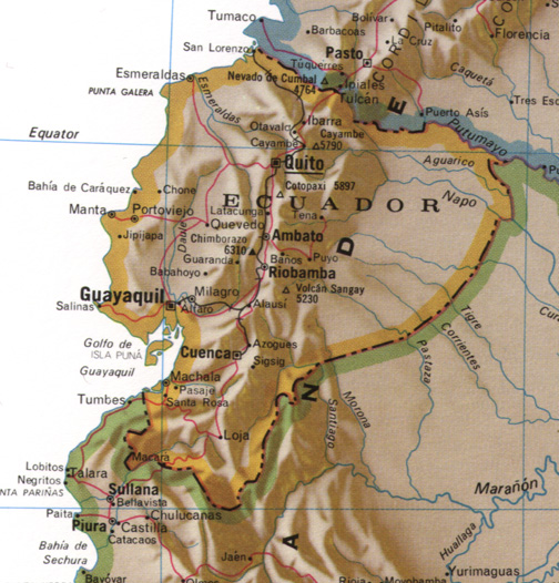 The jungles in Ecuador are inhabited by the Jibaro Tribe. They are headhunters, also there were reports of cannibalism. Ecuador was always covered with clouds, with several mountains close to 20,000 ft. Mt. Chimborazo always sticking up ominously through the clouds. Cotopaxi is the highest active volcano in the world. I always figured every cloud had a rock in it. I made numerous flights to Quito, at times instructing their military on lab procedures. They received thousands of dollars worth of equipment from the U.S. and never knew how to install it. I was able to get everything uncrated and up and working. |
