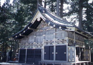 This is a sacred stable. The white horse given by the emperor used to be stabled there. There are many carvings of monkies on the lintle. The monkey is thought to be a mascot of the horse, so there are many carvings of them. |