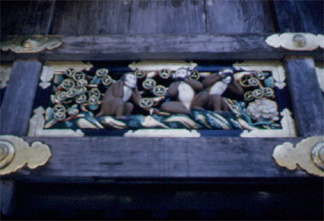 There are three monkies on the second lintle... See no evil, hear no evil nor speak any evil, which are the original carving. The series of the monkey carvings represents the life of a man as it occurrs through the successive chapters of life. |