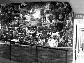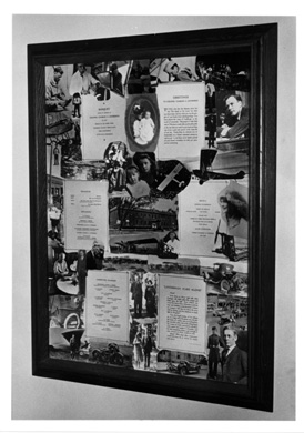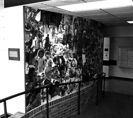 The above collage mural (installed right on the wall) was created to decorate the rear entrance area of St. Gabriels Hospital, Little Falls, Minnesota. The craftsman involved was authorized to select photos of choice and create a display that would be of interest to all who passed through this entryway on a daily basis. The area involved was about 7' tall and 18' long on a wall with undulating curves. Approximately 300 photographs were enlarged and printed on double weight fiber paper. In the collage-making process, approximately 265 of these were selected and placed on the wall. The wall was primed with white acrylic paint, then two coats of artists gesso. An undercoat of clear acrylic varnish was then applied and allowed to dry. The photos were then progressively installed in place, using standard collage-making techniques and procedures. The work was accomplished in 1978 and, as of this writing, remains in place, entertaining visitors to St. Gabriels Hospital.