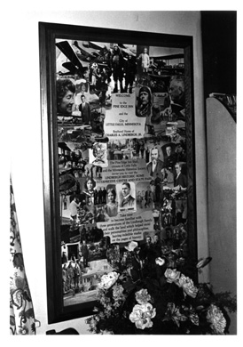 Above: These two framed photo collage displays were designed to depict elements of the history of Charles A. Lindbergh, who spent significant portions of his years as a youth on a farm along the Mississippi River, near Little Falls, Minnesota. The displays were created in the 1980s to welcome visitors and guests to the Historic Pine Edge Inn of Little Falls. While on his 48 state tour, after his historic non-stop flight from New York to Paris, Charles included a stop at his old home town where a parade and banquet were held in his honor. The banquet was held in the Pine Edge Inn basement banquet room. The display on the right includes photo copies of the banquet program.